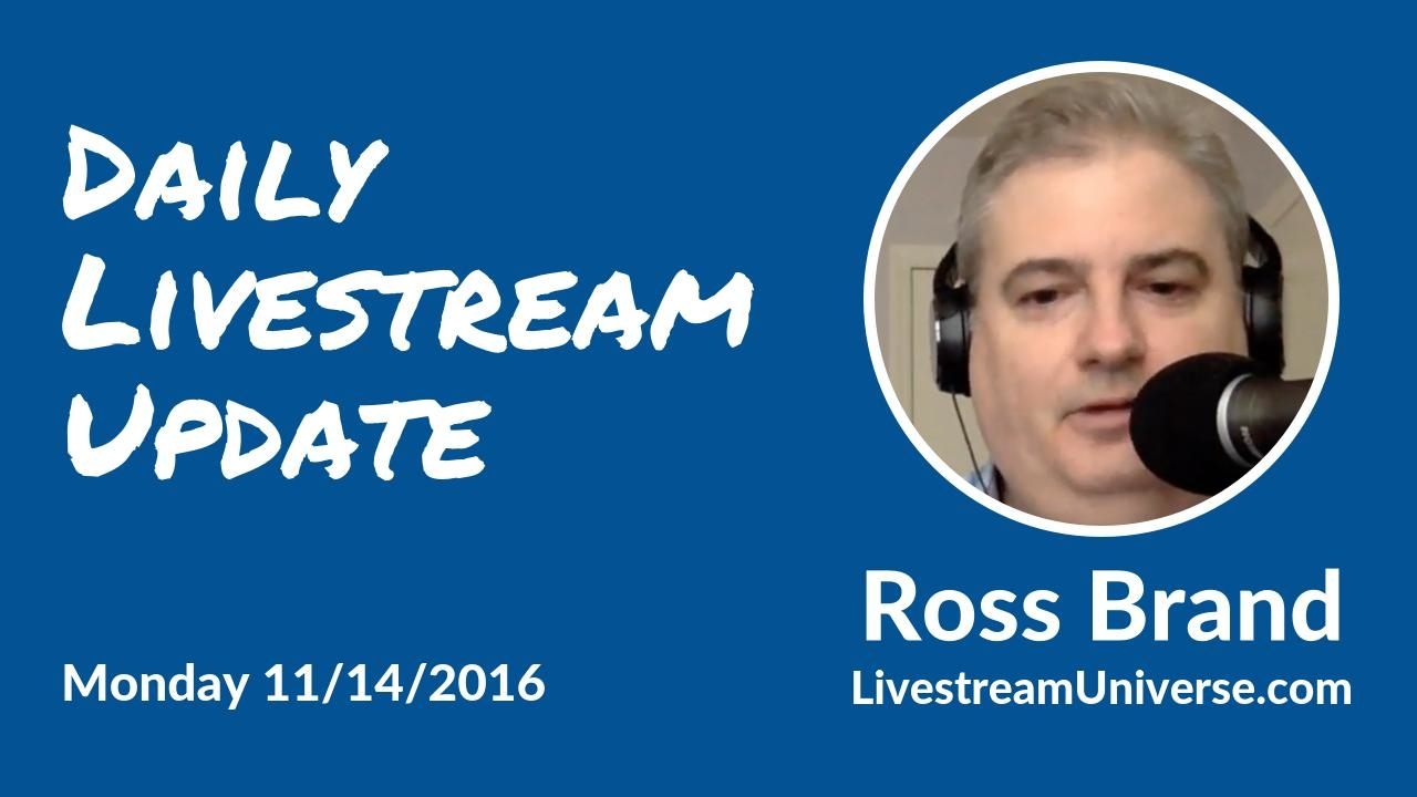 The Daily Livestram Update for November 17, 2016. Hosted by LivestreamUniverse.com editor Ross Brand. Raven Blair Glover says turn your livestream interviews into cash plus today’s highly-recommended programming featuring Todd Bergin, Stacy Lynn, Korie Robertson, Mariam Yahia Ibrahim Ishag, Jayson Bates, Stephen Cotton, Rj Redden, Sandra Centorino, Christian Karasiewicz, Nick Rishwain, Aaron Kilby, Dennis Yu of Adweek, Janine Truitt, Parish Michelle Blair, Shade Y. Adu, Steve Olsher, and Willie Crawford.
